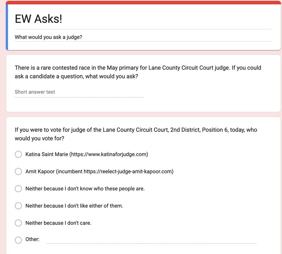 The election: Because they are so often uncontested, most voters forget that Lane County Circuit Court judges are elected to their positions. The May primary features a contested race.