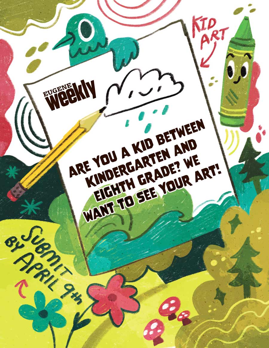 We’re on an arts kick today! So don’t forget — Earth Day is coming and we want to publish your kids’ and grandkids’ environmental art! We are asking for artists from kindergarten through eighth grade to draw themselves doing something they love in the outdoors, what they can do to help the planet or their favorite wildlife. Find more information — and templates for the art submissions here! Send the art, names, ages and schools by April 9 to McKenzie@EugeneWeekly.com or drop them off at 1251 Lincoln Street!
